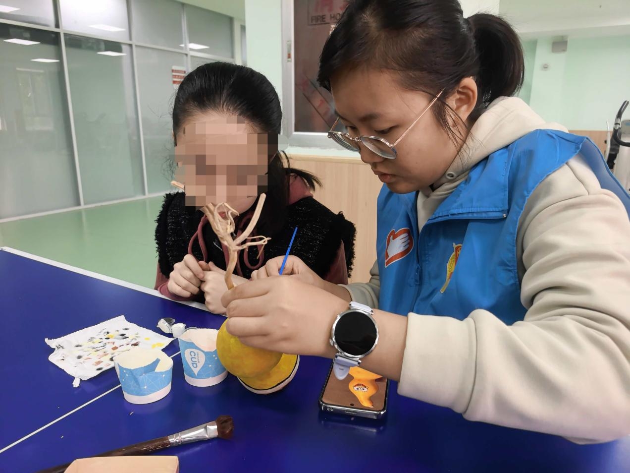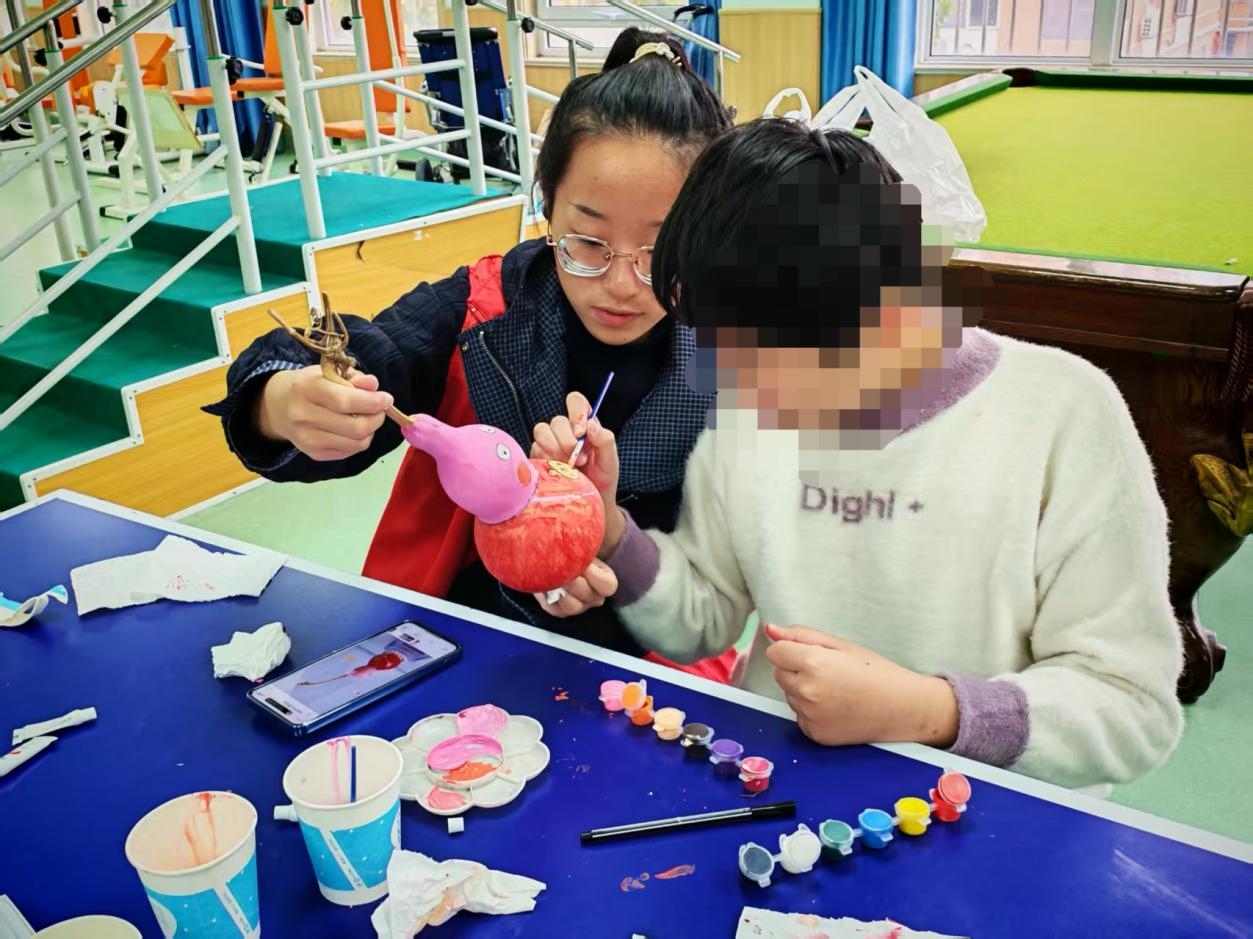 活动采取“引导+帮扶”相结合的方式有序推进。志愿者提前准备了表面光滑、印有卡通纹样的葫芦,以及可爱动物、经典动画角色的参考图片,以激发孩子们的创作兴趣。活动开始后,志愿者引导孩子们挑选自己喜欢的葫芦图案,并采取“一对一”协助的方式开展彩绘创作。面对动作协调性较弱的孩子,志愿者俯身细致地指导握笔和涂色技巧;对于色彩表现出浓厚兴趣的孩子,志愿者则耐心讲解基础色彩搭配原理。志愿者和孩子们之间的暖心互动营造了温馨和谐的氛围,拉近了彼此距离。