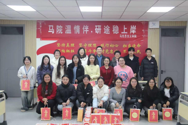 12月10日,马克思主义学院党委副书记、副院长刘凤芹,团委书记史仁扩,辅导员李洪霞、裴新丽于我院“一站式”学生社区为学生发放考研大礼包,预祝考研学子“马”到成功、一战成“硕”。